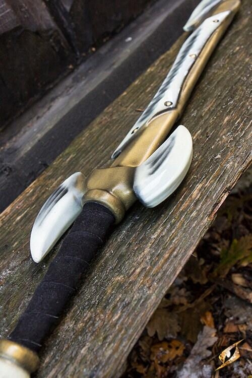 Det 66 cm buede blad er formet til at ligne skarpe knogler, der er nittet på, hvilket giver det et dødeligt udseende.
