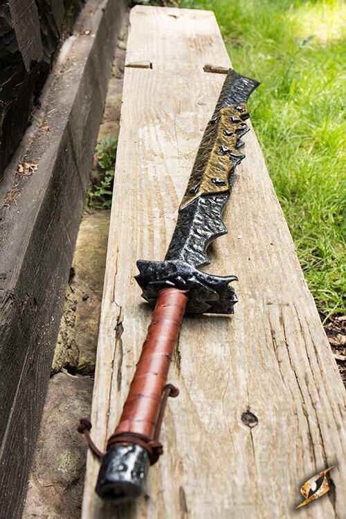 Crossguard har et hak, der ligner knust træ, og beskytter det robuste 20 cm håndtag indpakket i topkernet læder.