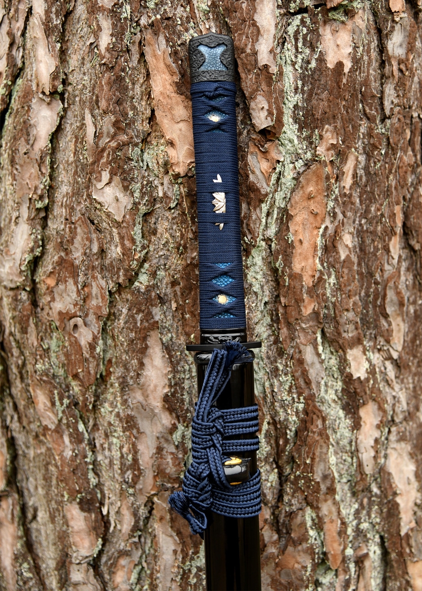 Den håndsmedede klinge har en autentisk Notare hamon, og dens koniske form mod spidsen sikrer hurtig manøvrering uden at gå på kompromis med kraften i stød og slag. Den diamanformede jern-tsuba (parérskive) tilføjer et strejf af shinobi-mystik, mens den dybsorte, specialformede saya (skede) gør sværdet let at trække. Sværdet er udsmykket med blå ray skin og tsuka-ito i nattemørk indpakning – designet til at afspejle skyggens kriger.