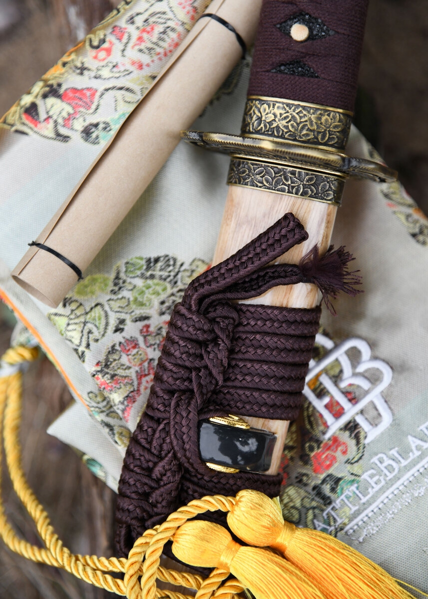 • Antikke Messingdetaljer: Udsøgt dekoration på menuki, fuchi, kashira, og koiguchi.