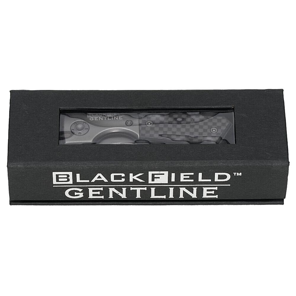 BlackField Gentline Boston Gentleman Foldekniv - En elegant og kompakt lommekniv med 50 mm titaniumbelagt blad af 440 rustfrit stål. Håndtag af kulfiber for lethed og styrke. Linerlock mekanisme for sikkerhed. Udstyret med en øje til fastgørelse af nøglering eller snor. Leveres i en attraktiv gaveæske. Vægt: 65 g. Perfekt til daglig brug og som en stilfuld gave.