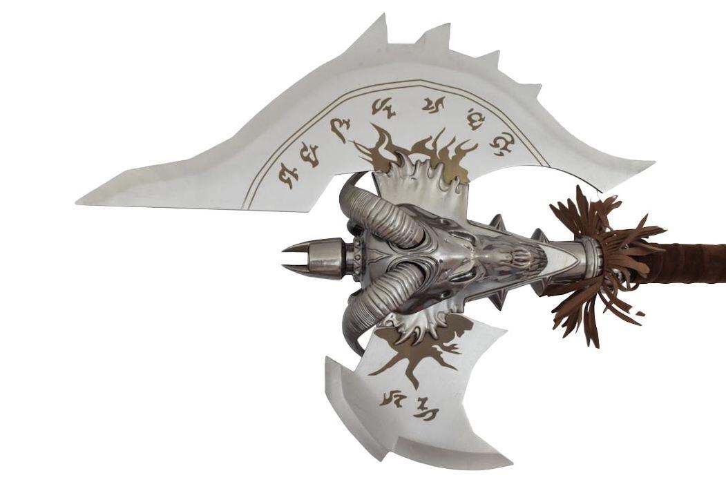 Legendary Shadowmourne Økse - World of Warcraft - En autentisk reproduktion af den legendariske økse fra det berømte videospil. Stålblad med indgraveringer, ruskindshåndtag, og stålknop. Leveres med vægbeslag. Bladlængde: 50 cm, samlet længde: 120 cm. Perfekt til dekoration og cosplay.