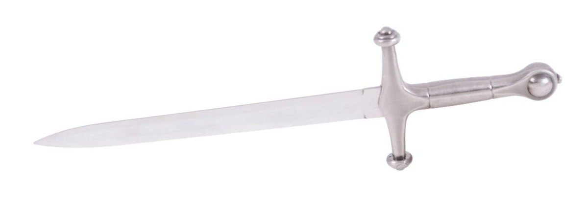 Uslebet brevåbner i rustfrit stål i form af en ridders middelalderdolk.