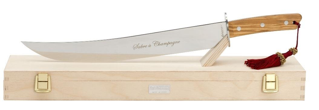 Eksklusiv Champagne sabel - Klingen er lavet af 420 rustfrit stål. Håndtaget er lavet af oliventræ.