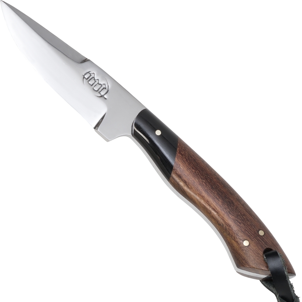 Håndtaget består af smukt Padouk træ, kendt for sin varme, rødlige farvetone og høje slidstyrke. De elegante bolster-detaljer i horn giver kniven et eksklusivt og harmonisk udtryk. Ved enden af håndtaget findes en sikkerhedsrem, som sikrer bedre greb og ekstra kontrol under brug – især i fugtige eller krævende forhold.