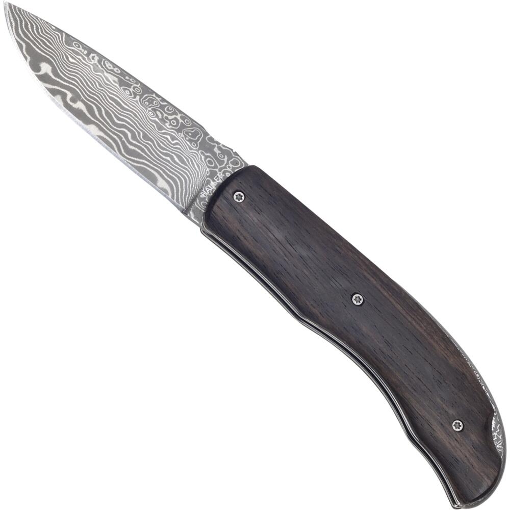 Damaskus Stål Foldekniv, Ibenholt Træ - Elegant lommekniv med klinge og fjeder i damaskusstål (71 lag). Håndtag af ibenholt træ, neglerille til nem åbning. Bladlængde: 70 mm, vægt: 100 g. Leveres i en eksklusiv trææske.