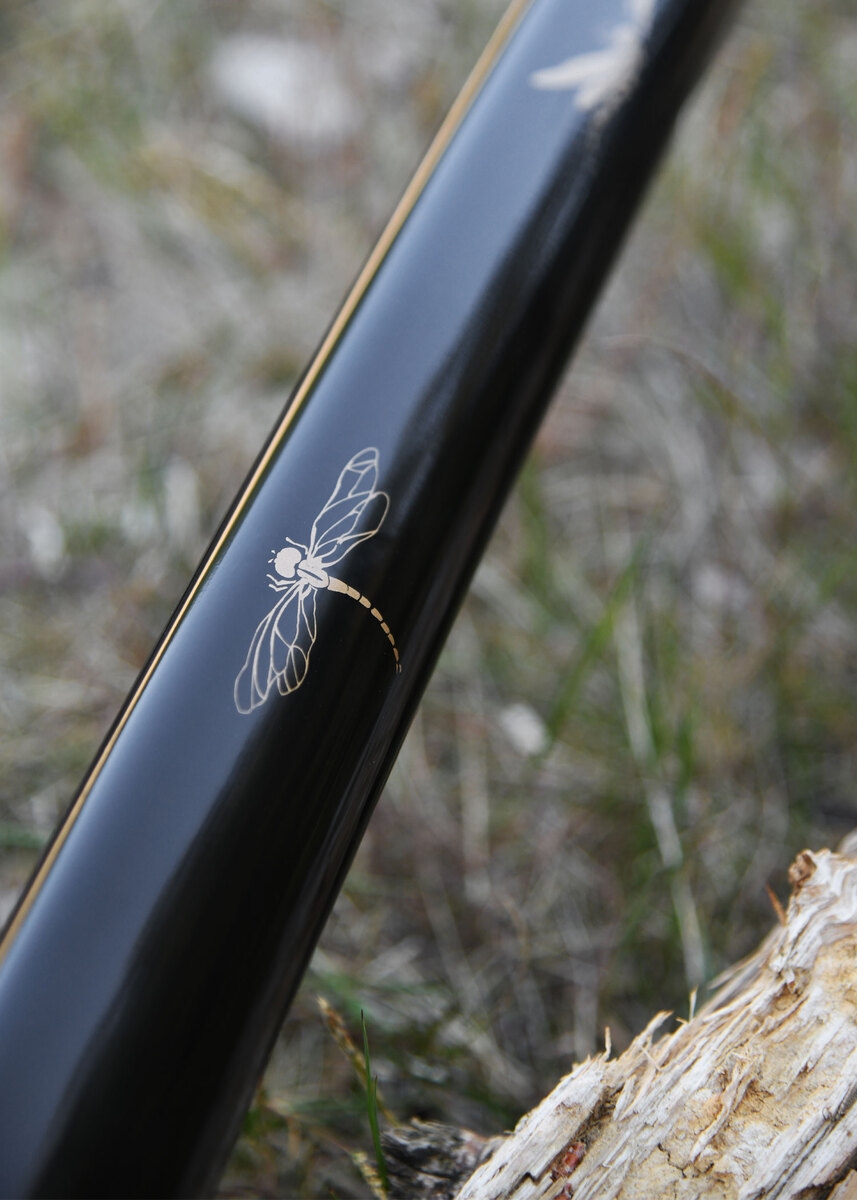 Sværdet er udsmykket med en dybt sortlakeret saya (skede), dekoreret med detaljerede guldsmedemotiver i guld, der symboliserer ynde, transformation og styrke i japansk kultur. Tsukaen (håndtaget) er beklædt med højkvalitets rokkehud (same) og omviklet med førsteklasses japansk bomuld i en elegant lilla farve. Den sorte tsuba (sværdbeskytter) er udsmykket med indlæg af guld og bronze, som fremhæver en smukt udført dragescene, der tilføjer et element af mystik og skønhed til sværdet.
