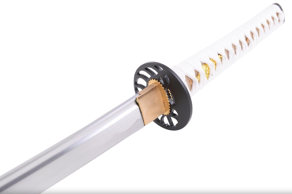 - Håndtag: Hvid flettet Tsuka med beige rokkeskind og gylden Komainu