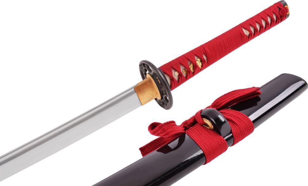 Denne katana i ét stykke (Full Tang Construction) har et Maru-slebet blad med en Fuller, et rødt flettet håndtag, en sort stålbeskyttelse (Tsuba) og en storslået lakeret træskede (Saya) med rød Sageo.
