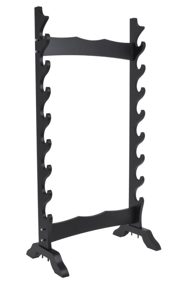 Flot stativ til 8 våben, udført i lakeret træ og sort satin. 100Cm højt, og 50cm bred.