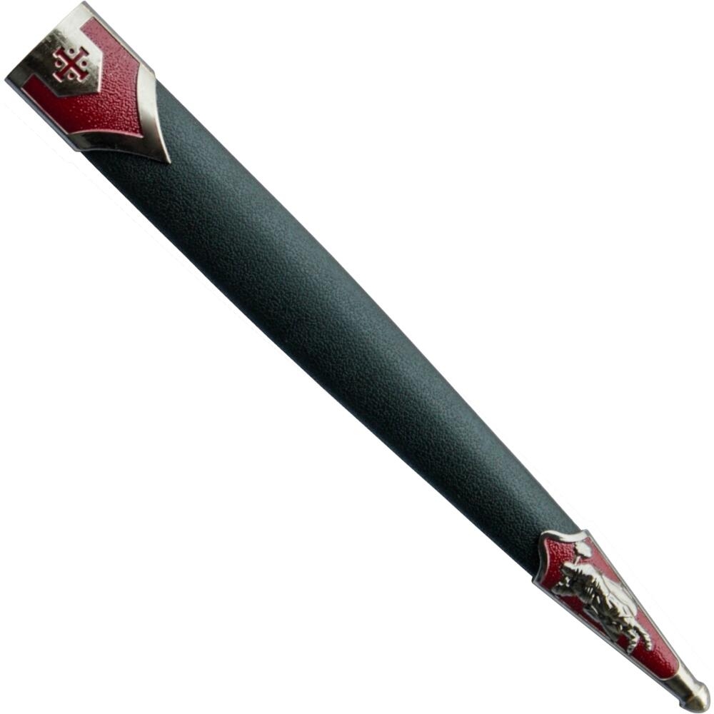 Skede: Inkluderet er en skede lavet af syntetiske materialer, forsynet med metalbeslag, der tilføjer et strejf af autenticitet og elegance til dolken.