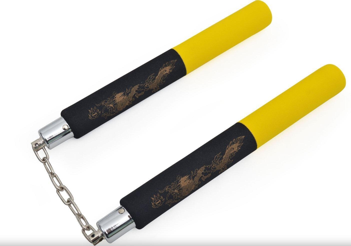 Oplev elegance og sikkerhed i ét med vores 2-farvede skum Nunchaku med et fortryllende gulddragemotiv! Vælg mellem gul og rød.