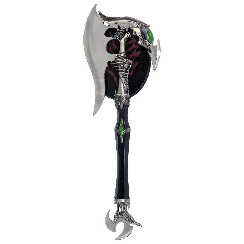 Øksebladet er lavet af rustfrit stål, i højre side er der indsat en aftagelig dolk. Med vægpanel i træ. Med vægpanel i træ.