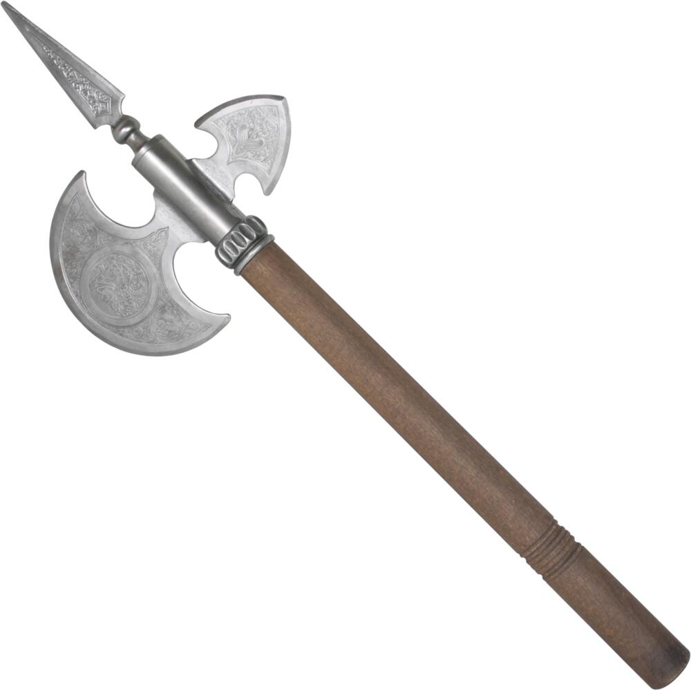 Denne graverede ridder stridsøkse er både et imponerende våben og et kunstnerisk mesterværk. Med detaljerede indgraveringer, et smedet kulstofstålhoved og en ekstra spids er den perfekt til både reenactments, udstillinger og som en værdifuld genstand for samlere og middelalderentusiaster.