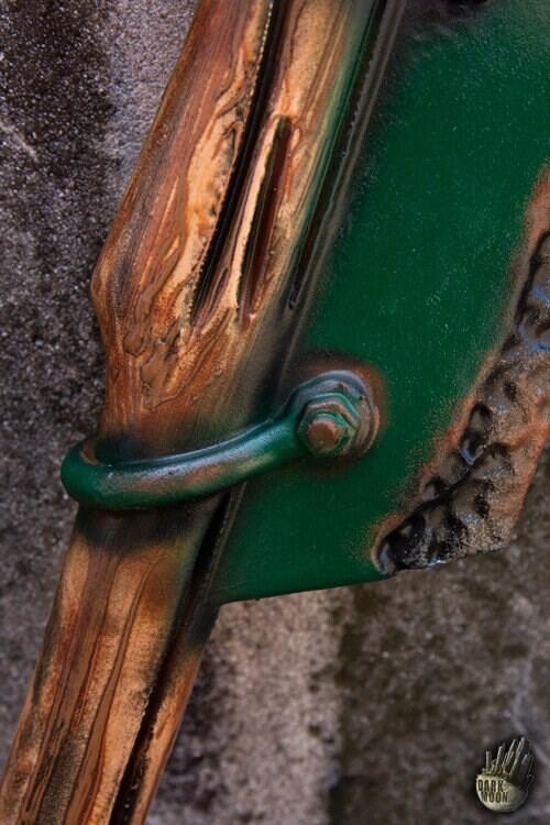Denne 97 cm lange Bush Hook har et 56 cm håndtag håndmalet og udskåret for at ligne træ. Det er fastgjort til et langt, økselignende hoved med en buet krog. Det 39 cm lange hoved er malet for at ligne grønmalet metal med rustne og slidte kanter.