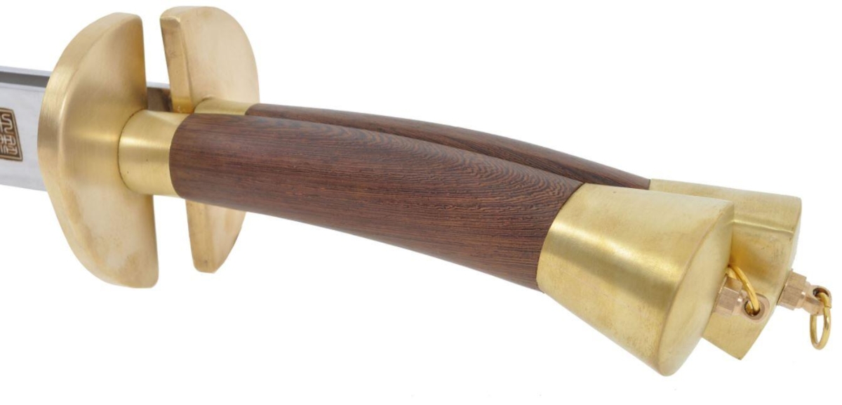 Traditionelt dobbelt bredsværd/Sabel lavet af Jian Wang smedje i Longquan. Blade i poleret rustfrit stål med en skinnende finish. Bagua- og smedelogoer er indgraveret tæt på guarden. Simple kobberdele, ikke indgraveret.