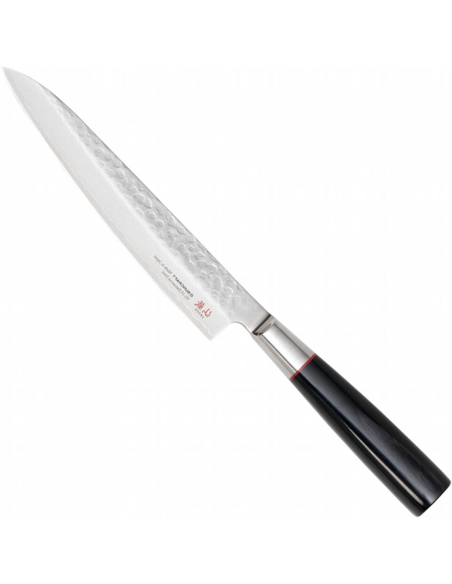 Klingen består af 33 lag rustfrit damaskus stål. Kernelaget er lavet af VG10 stål med en Rockwell hårdhed på 60-61°. Den er beskyttet på begge sider af et lag af nikkel og sølv. Derudover er der smedet 16 lag Damaskus-stål på hver. Vingen, der er konstrueret på denne måde, giver den højest mulige kantfastholdelse samtidig med den størst mulige fleksibilitet. Den perfekte højglans polering samt et håndtag af sort pakka-træ, som ligger ergonomisk i hånden takket være sin kastanjeform, runder dette mesterværk perfekt af. Overfladestrukturen som en hyldest til traditionelle smedeteknikker presses ind med maskine.