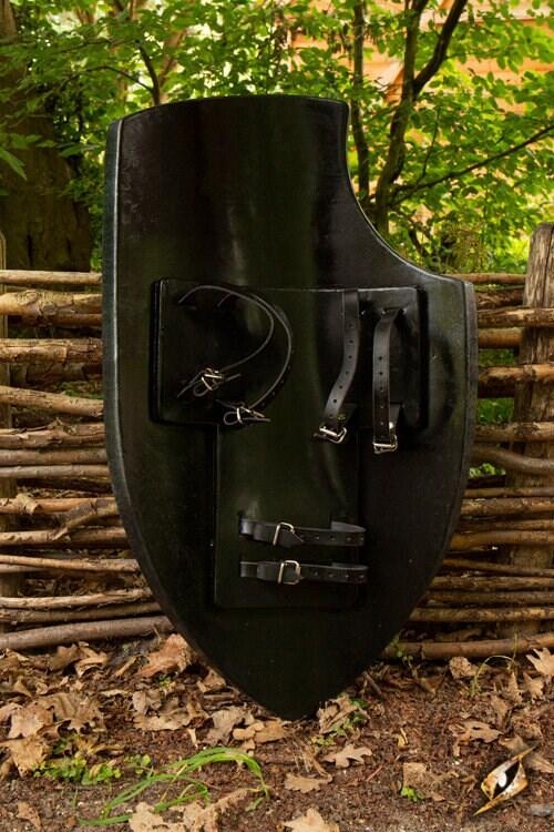 Knight Shield er et medium skjold inspireret af det 15. århundrede. Et håndmalet grønt, hvidt og guldstribet front efterligner et traditionelt heraldisk design.