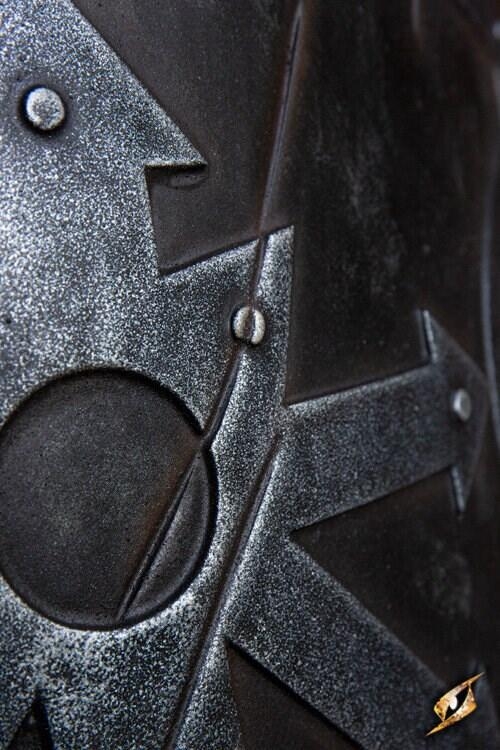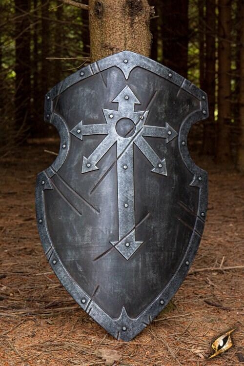 Lavet af slidstærkt skum med lukket celle og overtrukket med latex, dette skjold er mere end klar til LARP-kamp. Skulptureret og håndmalet med realistiske detaljer som ridser og indhak, dette skjold har en mørk mat metallisk finish og metallisk trim med nitter. Et kors vises i midten. Bevar dit greb om dette vilde skjold med tri-position greb og justerbare spænderemme, der findes på indersiden.