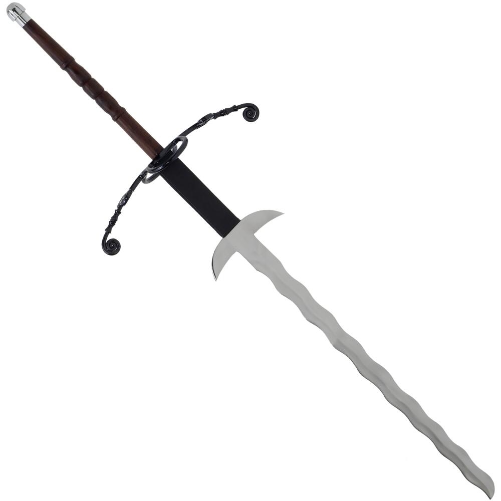 Den bølgede klinge er fremstillet af solidt kulstofstål, som giver sværdet et autentisk og dramatisk udtryk. Med en klingelængde på hele 100 cm og en samlet længde på 144 cm er dette Flammberge sværd langt større end typiske ét-hånds sværd og er derfor ideelt som vægdekoration, udstillingsstykke eller som del af et middelalder- eller fantasy-inspireret interiør.