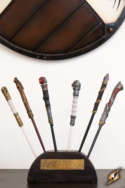 Håndlavet af ægte træ, hver Wand Stander har sin egen unikke look og farve og er slebet til en glat finish. Den forreste del af blokken er dekoreret med en messingplade indgraveret med Epic Armory-logoet.