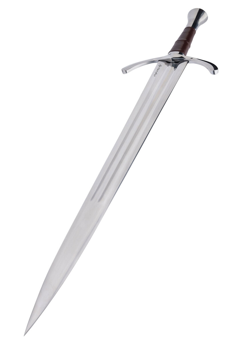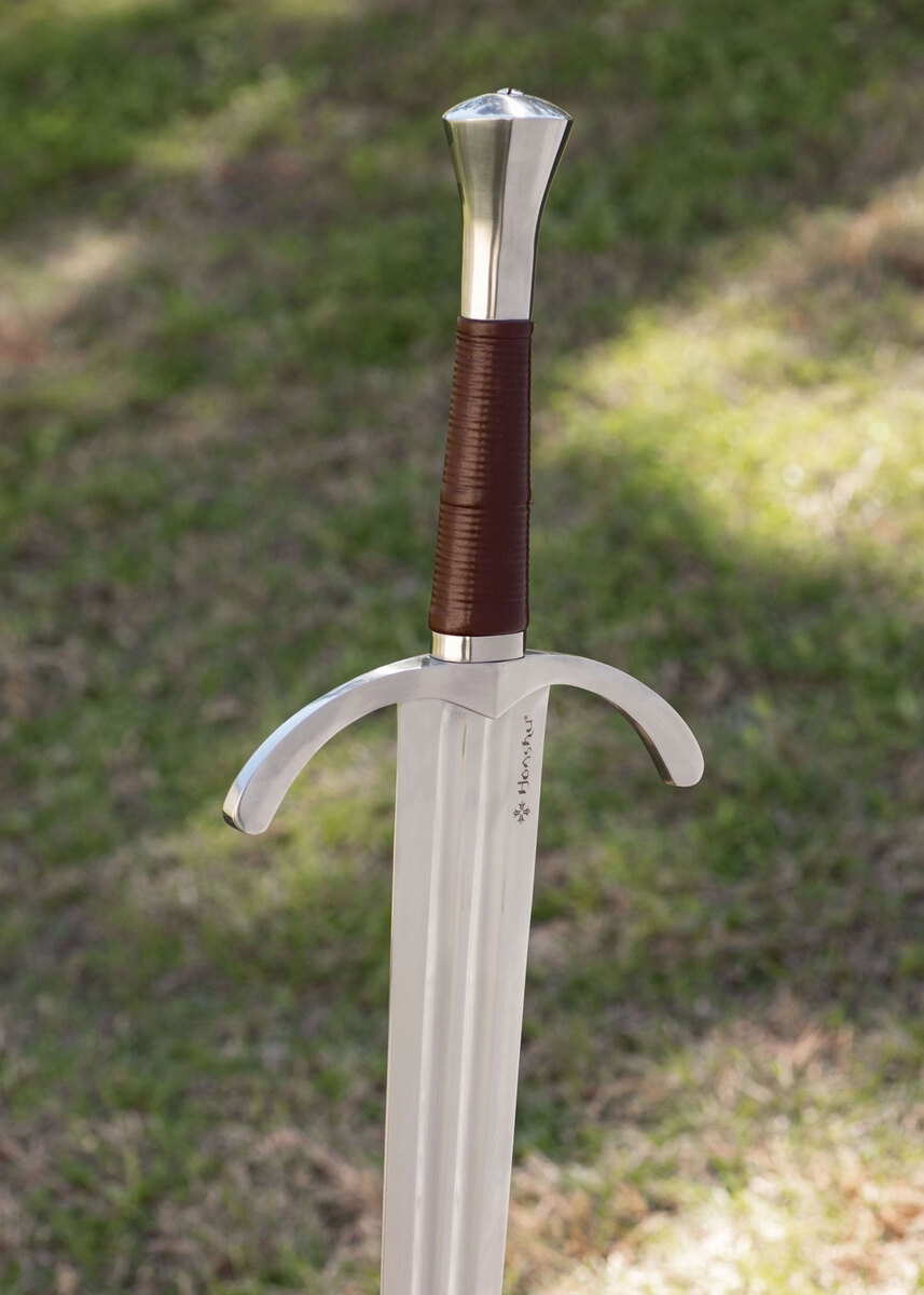 Håndtaget er fremstillet i træ og omviklet med brunt læder, hvilket giver et komfortabelt og sikkert greb. Den tunge pommel i poleret stål bidrager til sværdets fremragende balance og gør håndteringen stabil og kontrolleret. Med en samlet længde på ca. 102 cm og en vægt på ca. 1,75 kg har sværdet en solid, autentisk fornemmelse uden at være uhåndterligt.