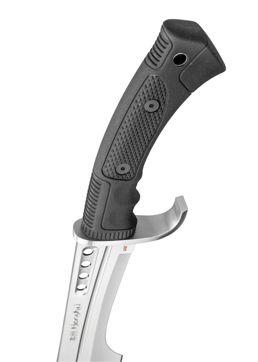 Det kraftige, buede parérstykke i rustfrit stål beskytter hånden effektivt og bidrager til et sikkert greb. Håndtaget er lavet i slidstærkt og skridsikkert TPR-materiale med ergonomiske fingerriller og tekstureret overflade, som sikrer høj komfort og kontrol. Sværdet leveres med en solid læderskede med bæltestrop, så det nemt kan bæres eller opbevares sikkert.