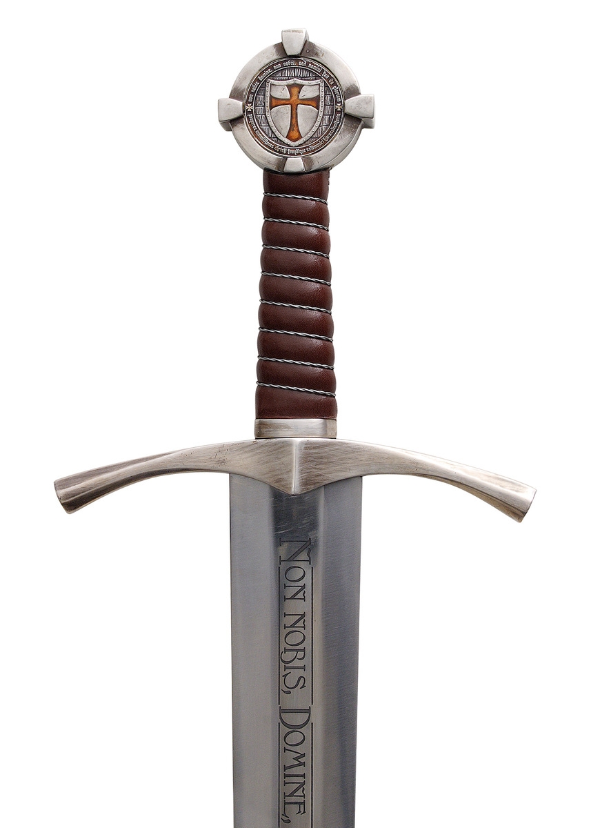 Pommelen er udsmykket med detaljerede Tempelridder-mønter på begge sider, komplet med latinske inskriptioner og velkendte symboler fra ordenen. Grebet er håndomviklet i dybrødt, ægte læder med trådomvikling, hvilket giver både et eksklusivt udtryk og et historisk korrekt design.