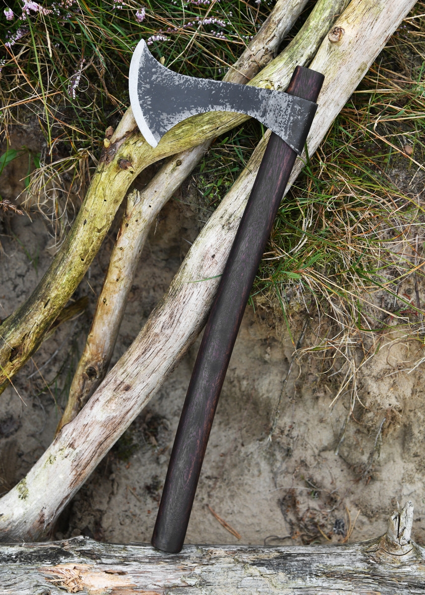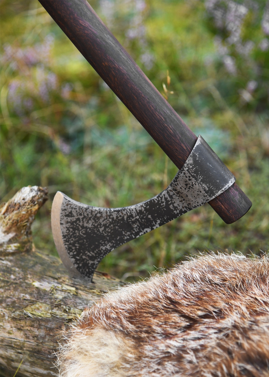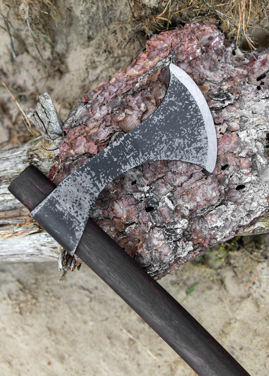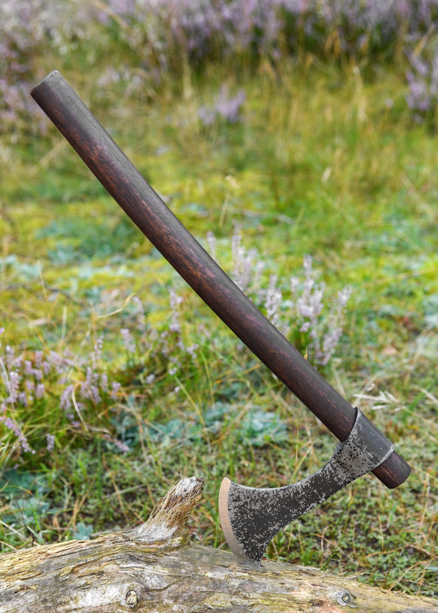 Skaftet er fremstillet i træ med en let kurvet form, der ligger godt i hånden og giver en naturlig balance. Med en samlet længde på ca. 46,5 cm og en vægt på ca. 510 g føles øksen let og livlig, hvilket afspejler dens historiske anvendelse som både håndvåben og kasteøkse. Den rustikke finish på skaftet bidrager til den autentiske oplevelse og gør øksen til et oplagt udstillingsstykke.