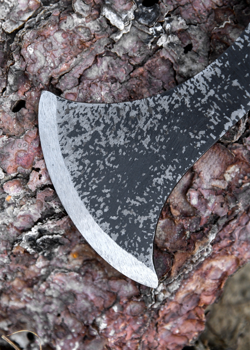 Øksehovedet er håndsmedet i 1065 high carbon steel, hvilket giver en stærk og realistisk profil, tro mod originalernes robuste konstruktion. Den rustikke smedefinish understreger det historiske præg og giver øksen et råt, tidstypisk udseende. Med en bladlængde på ca. 10,6 cm og et hoved på 18,6 cm fremstår Francescaen kompakt, men markant – præcis som de våben, der blev båret af frankiske krigere.