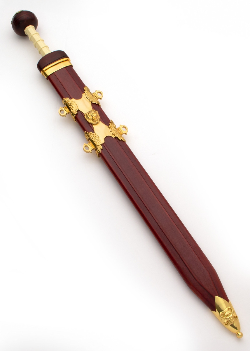 Skeden er et kunstværk i sig selv: en træskede indbundet i rødbrunt læder, prydet med forgyldte beslag og relieffer af en gladiator og en løve – symboler på styrke og ære i arenaen. Denne historisk korrekte konstruktion gør sværdet til et imponerende samleobjekt eller rekvisit til kostumer og udstillinger.